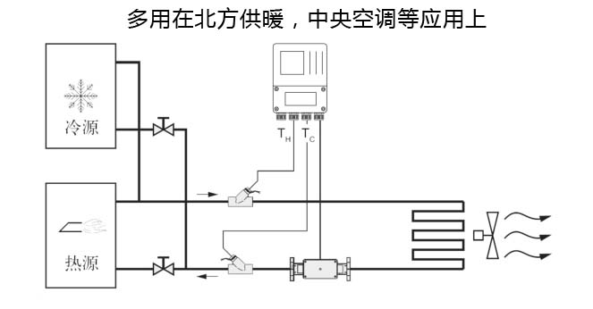 LDGR-SIN電磁熱量表是將一對(duì)溫度傳感器分別安裝在通過載熱流體的上行管和下行管上,流量計(jì)安裝在流體入口或回流管上(流量計(jì)安裝的位置不同,最終的測(cè)量結(jié)果也不同),流量計(jì)發(fā)出與流量成正比的脈沖信號(hào),一對(duì)溫度傳感器給出表示溫度高低的模擬信號(hào),而積算儀采集來自流量和溫度傳感器的信號(hào),利用積算公式算出熱交換系統(tǒng)獲得的熱量。