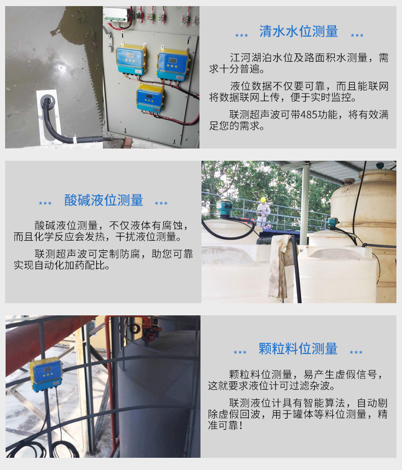 應用行業 聯測儀表SIN-DFG分體式超聲波液位計廣泛用于罐體、水池、水庫的液位和體積測量,也可用于明渠的流量測量。