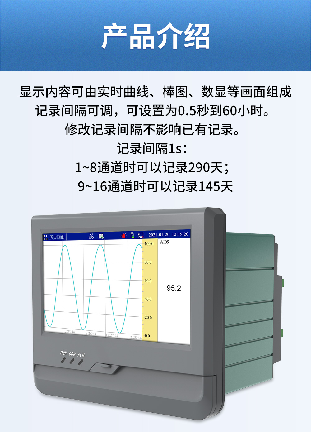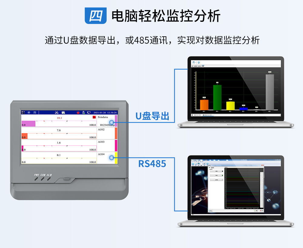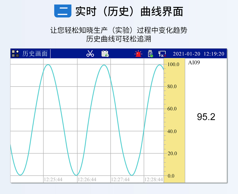 觸摸式彩色無紙記錄儀具有 60 個運算函數、24 路模擬量輸入、3 路 開關量輸入、3 路脈沖量輸入、6 路模擬量變送輸出、16 路開關量輸出, 可實現運算、顯示、記錄、報警、分析統計報表、高速采樣等功能,通 過 RS-232/RS-485 和以太網通訊接口,可實現遠程實時監控、組態管理、 歷史數據讀取等功能,通過 U 盤可實現組態管理、監控畫面管理和歷史 數據管理等功能。