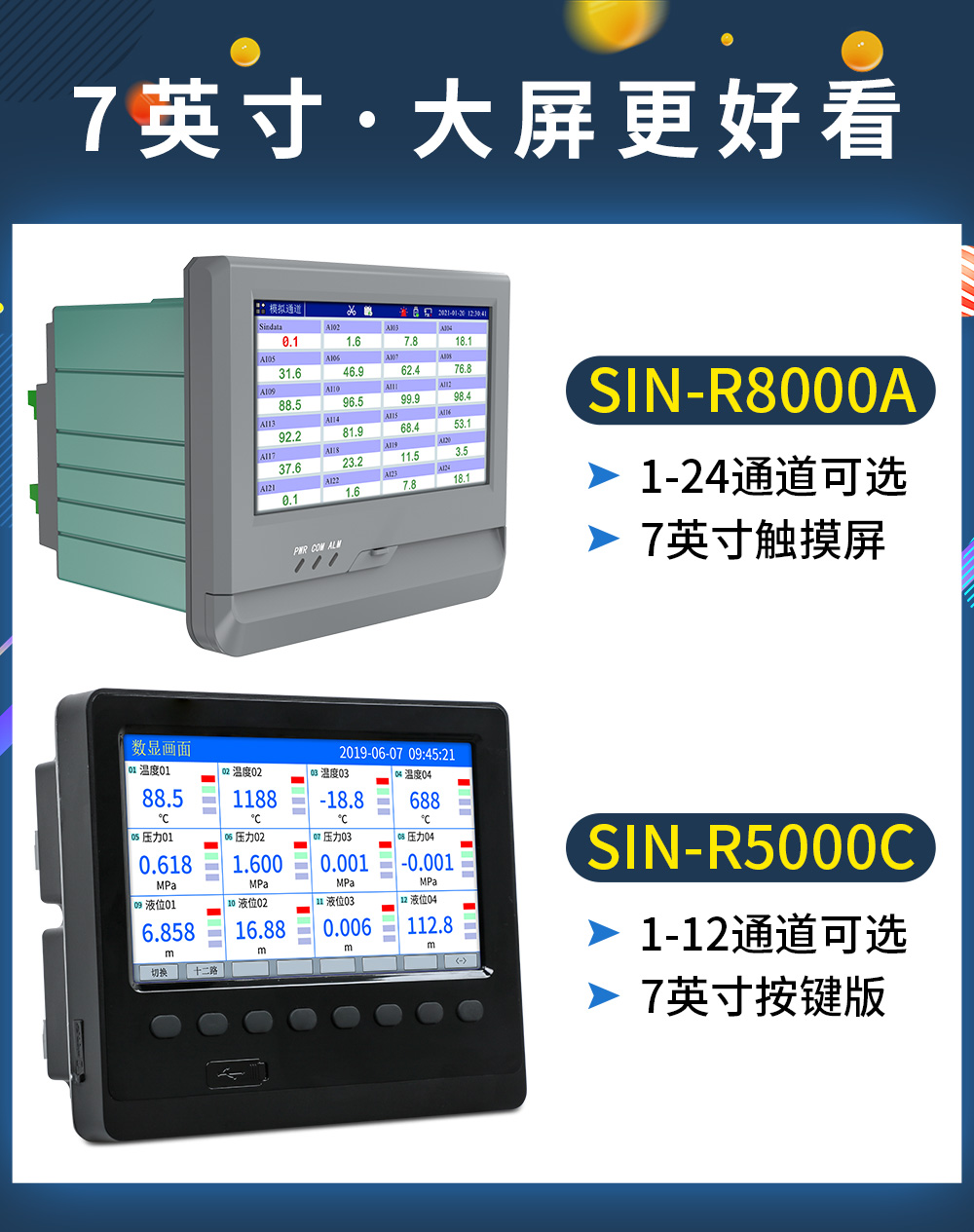聯測儀表SIN-R8000A觸摸屏7英寸無紙記錄儀0.5S高速采集1-24路可選